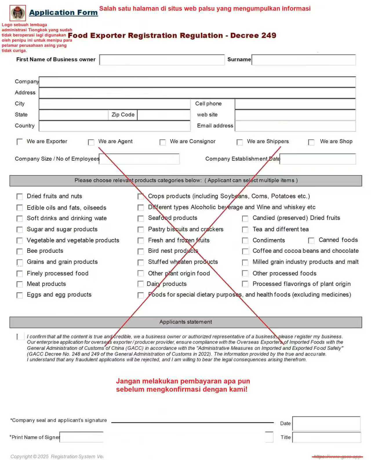 Berikut ini adalah peringatan yang dikeluarkan oleh situs web resmi Bea Cukai Tiongkok yang berjudul "Pernyataan tentang Waspada terhadap Situs Web Pendaftaran Palsu":