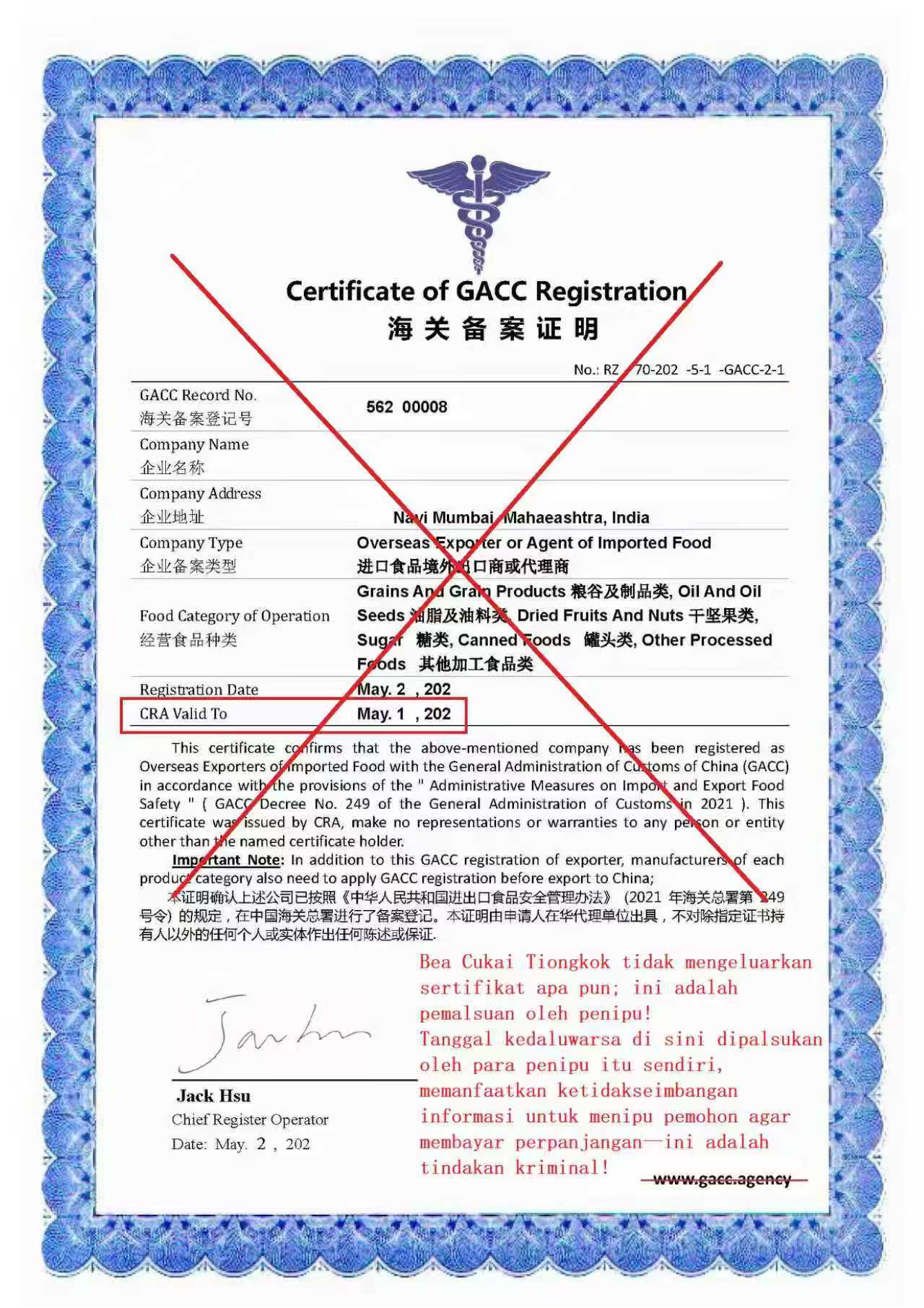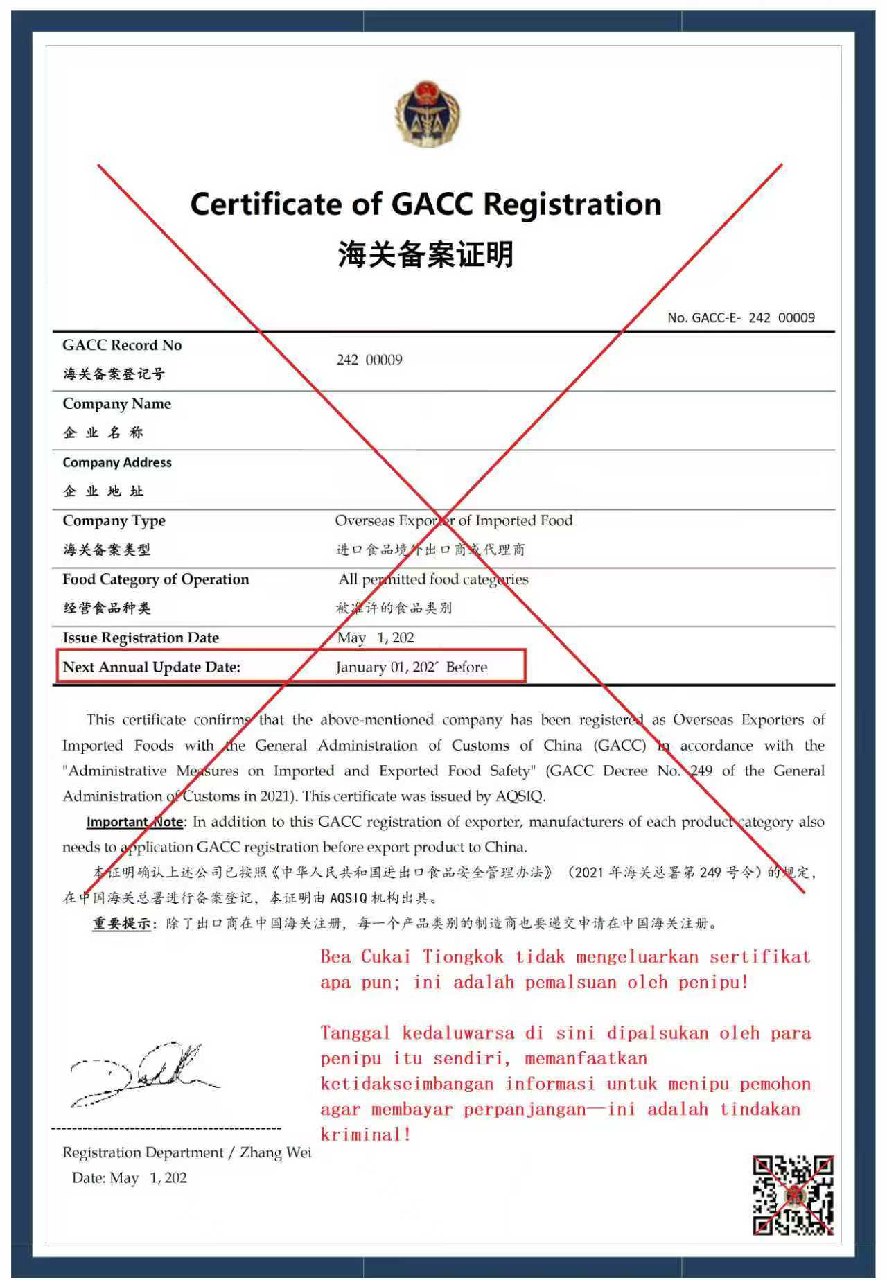3. Membuat sertifikat sendiri dan mencoba mengenakan biaya setiap tahun (Bea Cukai Tiongkok tidak menerbitkan sertifikat, dan tidak ada batasan masa berlaku untuk kualifikasi pendaftaran eksportir. Ini adalah tindakan kriminal yang jelas terhadap pelamar luar negeri dengan memanfaatkan asimetri informasi)